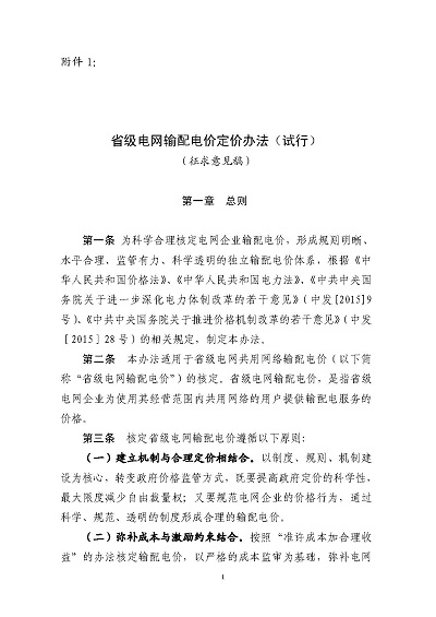 根據(jù)《中共中央國務(wù)院關(guān)于推進(jìn)價(jià)格機(jī)制改革的若干意見》(中發(fā)[2015]28號)、《中共中央國務(wù)院關(guān)于進(jìn)一步深化電力體制改革的若干意見》(中發(fā)[2015]9號)的相關(guān)規(guī)定,為建立規(guī)則明晰、水平合理、監(jiān)管有力、科學(xué)透明的獨(dú)立輸配電價(jià)體系,提高價(jià)格監(jiān)管的科學(xué)性、規(guī)范性和透明度,推進(jìn)輸配電價(jià)改革和電力市場建設(shè),我委會(huì)同有關(guān)方面擬定了《省級電網(wǎng)輸配電價(jià)定價(jià)辦法(試行)》(以下簡稱《辦法》),F(xiàn)予以公告,向社會(huì)公開征求意見。歡迎各界人士踴躍參與,積極建言獻(xiàn)策。