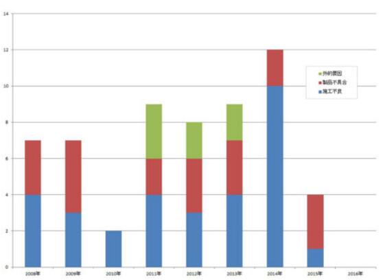 在登記的102起事故中,目前已有58起推測(cè)出了原因(圖2)。分類為“施工不合格”、“產(chǎn)品不合格”、“外部原因”。