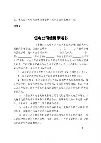 根據(jù)《中共中央國(guó)務(wù)院關(guān)于進(jìn)一步深化電力體制改革的若干意見》(中發(fā)〔2015〕9號(hào))及其配套文件精神,按照國(guó)家發(fā)展改革委 國(guó)家能源局《關(guān)于印發(fā)電力體制改革配套文件的通知》(發(fā)改經(jīng)體〔2015〕2752號(hào))、《關(guān)于印發(fā)〈售電公司準(zhǔn)入與退出管理辦法〉和〈有序放開配電網(wǎng)業(yè)務(wù)管理辦法〉的通知》(發(fā)改經(jīng)體〔2016〕2120號(hào))、國(guó)家能源局華北能源監(jiān)管局《關(guān)于印發(fā)〈華北區(qū)域電力市場(chǎng)內(nèi)蒙古電力多邊交易市場(chǎng)運(yùn)營(yíng)規(guī)則(2016 修訂版)〉的通知》(華北監(jiān)能市場(chǎng)〔2016〕422 號(hào))、內(nèi)蒙古自治區(qū)經(jīng)濟(jì)和信息化委員會(huì)《關(guān)于印發(fā)〈華北區(qū)域電力市場(chǎng)內(nèi)蒙古電力多邊交易市場(chǎng)主體準(zhǔn)入和管理辦法〉的通知》(內(nèi)經(jīng)信電力字〔2016〕336號(hào))及國(guó)家有關(guān)法律法規(guī)的要求,經(jīng)商國(guó)家能源局華北監(jiān)管局、國(guó)家能源局東北監(jiān)管局,售電公司按照“一承諾、一公示、一注冊(cè)、三備案”的方式進(jìn)行市場(chǎng)準(zhǔn)入,現(xiàn)就售電公司申報(bào)參與電力市場(chǎng)相關(guān)事宜通知如下...