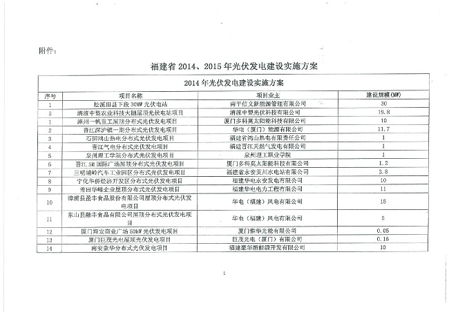 現(xiàn)將水電水利規(guī)劃設(shè)計(jì)總院《關(guān)于確認(rèn)福建省2014、2015年光伏建設(shè)實(shí)施方案的函》(水電規(guī)信息函〔2016〕9號(hào))轉(zhuǎn)發(fā)你們。請(qǐng)你們按規(guī)定做好項(xiàng)目建設(shè)管理工作,并通知轄區(qū)內(nèi)相關(guān)項(xiàng)目單位按《國家能源局關(guān)于實(shí)行可再生能源發(fā)電項(xiàng)目信息化管理的通知》(國能新能〔2015〕358號(hào))和我委《關(guān)于進(jìn)一步完善光伏發(fā)電項(xiàng)目建設(shè)管理相關(guān)規(guī)定的通知》(閩發(fā)改能源〔2016〕640號(hào)),在國家能源局可再生能源發(fā)電項(xiàng)目信息管理平臺(tái)填報(bào)項(xiàng)目相關(guān)信息。