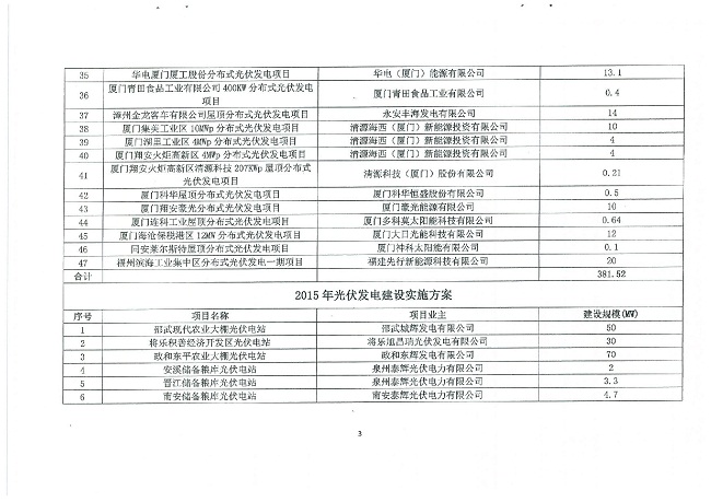 現(xiàn)將水電水利規(guī)劃設(shè)計(jì)總院《關(guān)于確認(rèn)福建省2014、2015年光伏建設(shè)實(shí)施方案的函》(水電規(guī)信息函〔2016〕9號(hào))轉(zhuǎn)發(fā)你們。請(qǐng)你們按規(guī)定做好項(xiàng)目建設(shè)管理工作,并通知轄區(qū)內(nèi)相關(guān)項(xiàng)目單位按《國(guó)家能源局關(guān)于實(shí)行可再生能源發(fā)電項(xiàng)目信息化管理的通知》(國(guó)能新能〔2015〕358號(hào))和我委《關(guān)于進(jìn)一步完善光伏發(fā)電項(xiàng)目建設(shè)管理相關(guān)規(guī)定的通知》(閩發(fā)改能源〔2016〕640號(hào)),在國(guó)家能源局可再生能源發(fā)電項(xiàng)目信息管理平臺(tái)填報(bào)項(xiàng)目相關(guān)信息。