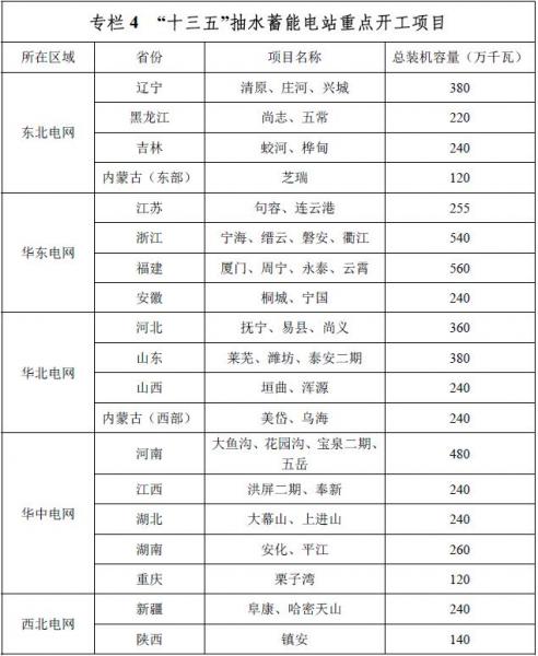 3、加快抽水蓄能發(fā)展。堅(jiān)持 “統(tǒng)籌規(guī)劃、合理布局 ”的原則,根據(jù)各地區(qū)核電和新能源開發(fā)、區(qū)域間電力輸送情況及電網(wǎng)安全穩(wěn)定運(yùn)行要求,加快抽水蓄能電站建設(shè)。抓緊落實(shí)規(guī)劃站點(diǎn)建設(shè)條件,加快開工建設(shè)一批距離負(fù)荷中心近、促進(jìn)新能源消納、受端電源支撐的抽水蓄能電站!笆 ”期間新開工抽水蓄能電站約6000萬千瓦,抽水蓄能電站裝機(jī)達(dá)到4000萬千瓦。做好抽水蓄能規(guī)劃滾動(dòng)調(diào)整工作,統(tǒng)籌考慮區(qū)域電力系統(tǒng)調(diào)峰填谷需要、安全穩(wěn)定運(yùn)行要求和站址建設(shè)條件,開展部分地區(qū)抽水蓄能選點(diǎn)規(guī)劃啟動(dòng)、調(diào)整工作,充分論證系統(tǒng)需求,優(yōu)選確定規(guī)劃站點(diǎn)。根據(jù)發(fā)展需要,適時(shí)啟動(dòng)新一輪的全國抽水蓄能規(guī)劃工作。加強(qiáng)關(guān)鍵技術(shù)研究,推動(dòng)建設(shè)海水抽水蓄能電站示范項(xiàng)目。積極推進(jìn)抽水蓄能電站建設(shè)主體多元化,鼓勵(lì)社會(huì)資本投資,加快建立以招標(biāo)方式確定業(yè)主的市場(chǎng)機(jī)制。進(jìn)一步完善抽水蓄能電站運(yùn)營管理體制和電價(jià)形成機(jī)制,加快建立抽水蓄能電站輔助服務(wù)市場(chǎng)。研究探索抽水蓄能與核能、風(fēng)能、太陽能等新能源一體化建設(shè)運(yùn)營管理的新模式、新機(jī)制。