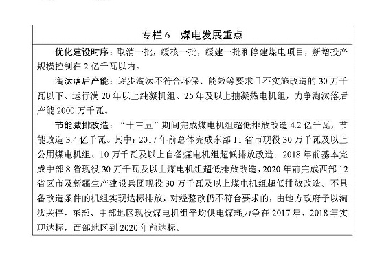 ——煤電。優(yōu)化規(guī)劃建設(shè)時(shí)序,加快淘汰落后產(chǎn)能,促進(jìn)煤電清潔高效發(fā)展。建立煤電規(guī)劃建設(shè)風(fēng)險(xiǎn)預(yù)警機(jī)制,加強(qiáng)煤電利用小時(shí)數(shù)監(jiān)測(cè)和考核,與新上項(xiàng)目規(guī)模掛鉤,合理調(diào)控建設(shè)節(jié)奏。“十三五”前兩年暫緩核準(zhǔn)電力盈余省份中除民生熱電和扶貧項(xiàng)目之外的新建自用煤電項(xiàng)目,采取有力措施提高存量機(jī)組利用率,使全國(guó)煤電機(jī)組平均利用小時(shí)數(shù)達(dá)到合理水平;后三年根據(jù)供需形勢(shì),按照國(guó)家總量控制要求,合理確定新增煤電規(guī)模,有序安排項(xiàng)目開(kāi)工和投產(chǎn)時(shí)序。民生熱電聯(lián)產(chǎn)項(xiàng)目以背壓式機(jī)組為主。提高煤電能耗、環(huán)保等準(zhǔn)入標(biāo)準(zhǔn),加快淘汰落后產(chǎn)能,力爭(zhēng)關(guān)停2000萬(wàn)千瓦。2020年煤電裝機(jī)規(guī)模力爭(zhēng)控制在11億千瓦以?xún)?nèi)。