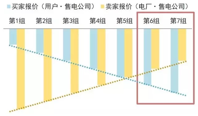 在用戶與電廠報(bào)價(jià)之后,交易中心會(huì)根據(jù)它們的報(bào)價(jià),排列它們交易的先后順序。降幅越小的用戶和降幅越大的電廠,越能排到前面,以此類推,一旦電廠的降幅小于和它對(duì)應(yīng)的用戶的降幅,比如說,電廠表示我每度電可以降1分錢,用戶卻希望每度電降2分錢,那么雙方就沒有成交的可能性了。也就是說,在下圖中,需求曲線和供給曲線交叉點(diǎn)右邊的報(bào)價(jià),已經(jīng)無法再進(jìn)行交易了。