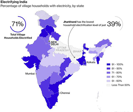 無電可用的人群中,有三分之二位于人口稠密的印度北部和東北部地區(qū),北方邦(Uttar Pradesh)和比哈爾邦(Bihar)尤甚。官方統(tǒng)計數(shù)據(jù)比現(xiàn)實中農(nóng)村的通電情況要樂觀得多。印度中央政府的數(shù)據(jù)顯示,北方邦和比哈爾邦只有不到一半的農(nóng)村家庭接入了電網(wǎng)。如果按照電氣化農(nóng)村的定義,截至1月23日,北方邦只有13個村莊缺電,比哈爾邦則有598個村莊缺電。