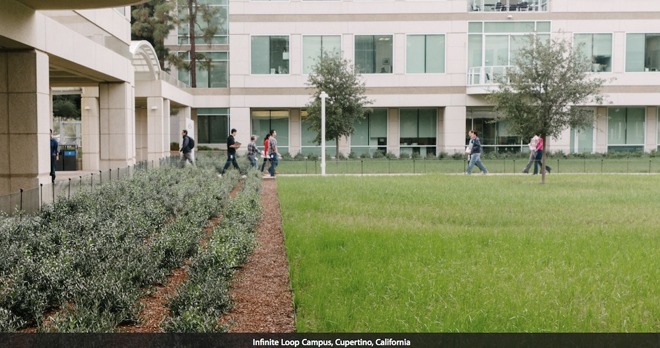 這些在漏水檢測和程序化供水的升級預(yù)計能節(jié)省下30%的水資源:2015年,該灌溉系統(tǒng)一年大概要用掉1530萬加侖的水資源。在過去的幾年時間內(nèi),蘋果Infinite Loop園區(qū)開始有組織地用本地草品種換下用于裝飾的樹木、草坪以及其他綠化。本地草品種對水的需求量更少。