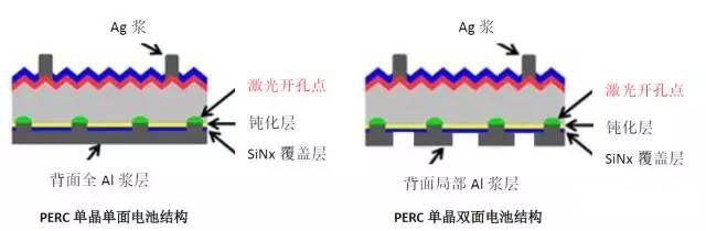 PERC單晶單面電池的背面為全Al層,背面入射光線無(wú)法穿透該全Al層,因此PERC單晶單面電池只有正面可以吸收入射光進(jìn)行光電轉(zhuǎn)換。為了使PERC電池均有雙面光電轉(zhuǎn)換功能,行業(yè)改變了PERC電池的印刷工藝,將背面全Al層印刷工藝修改為背面局部Al層印刷工藝。該工藝是盡量保證背面Al漿印刷在激光開(kāi)孔點(diǎn)處,以使光生電流仍然可以通過(guò)激光開(kāi)孔點(diǎn)的Al層導(dǎo)出。