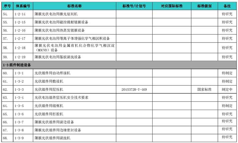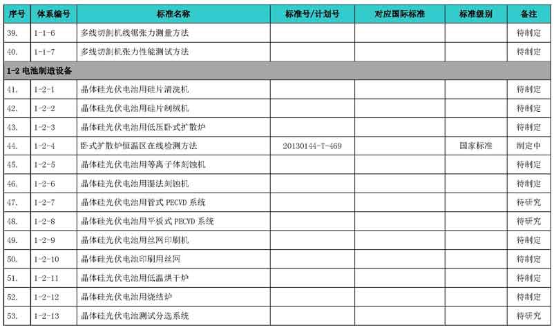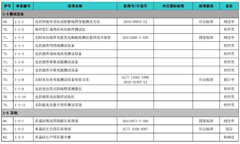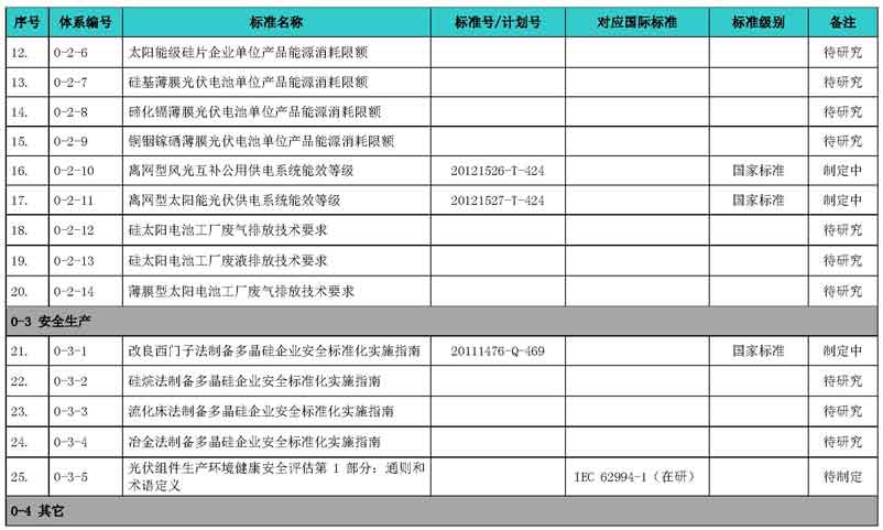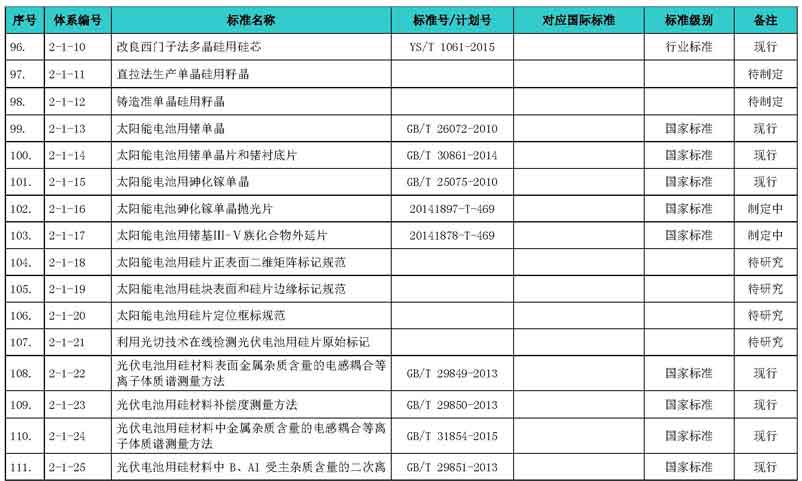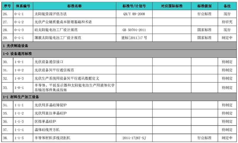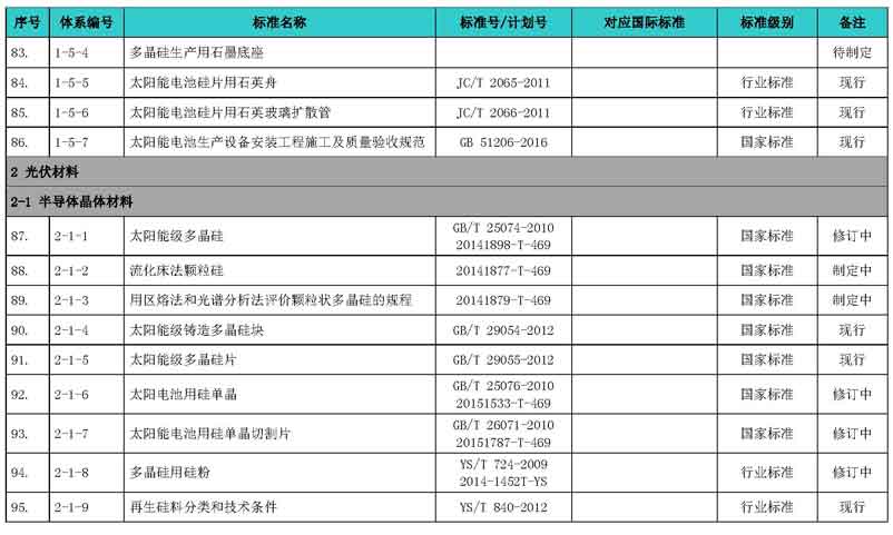 光伏產(chǎn)業(yè)綜合標(biāo)準(zhǔn)化技術(shù)體系表涵蓋國(guó)家標(biāo)準(zhǔn)和行業(yè)標(biāo)準(zhǔn),包括現(xiàn)有標(biāo)準(zhǔn)、制修訂中的標(biāo)準(zhǔn)、擬制修訂的標(biāo)準(zhǔn)和待研究的標(biāo)準(zhǔn),共500項(xiàng)。