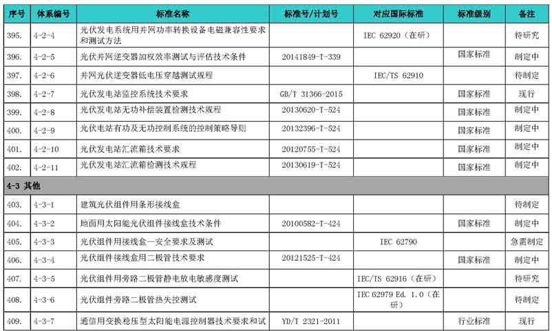 光伏產(chǎn)業(yè)綜合標(biāo)準(zhǔn)化技術(shù)體系表涵蓋國家標(biāo)準(zhǔn)和行業(yè)標(biāo)準(zhǔn),包括現(xiàn)有標(biāo)準(zhǔn)、制修訂中的標(biāo)準(zhǔn)、擬制修訂的標(biāo)準(zhǔn)和待研究的標(biāo)準(zhǔn),共500項(xiàng)。