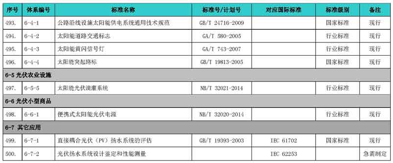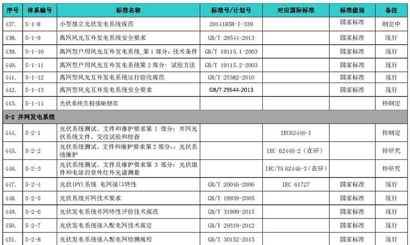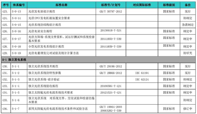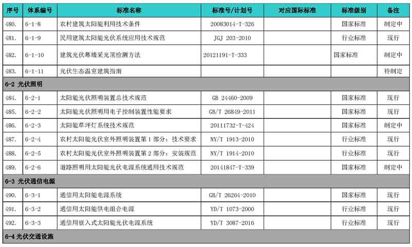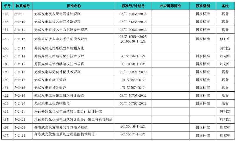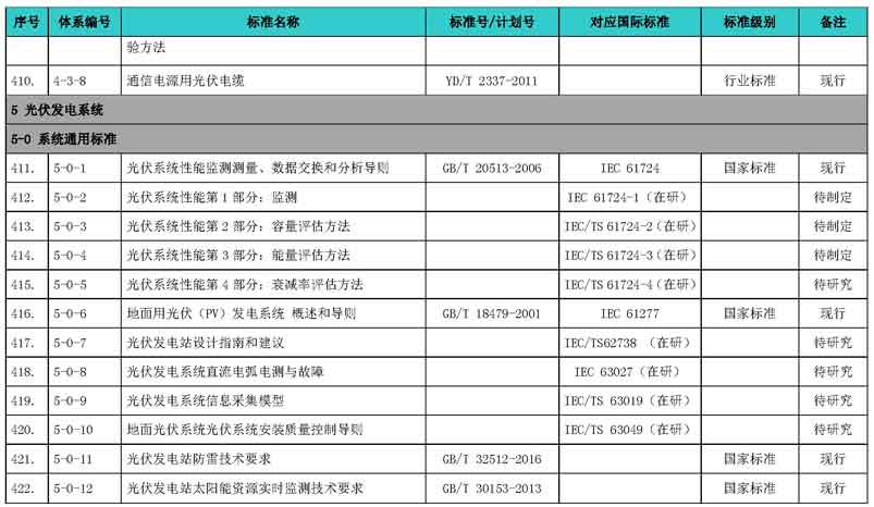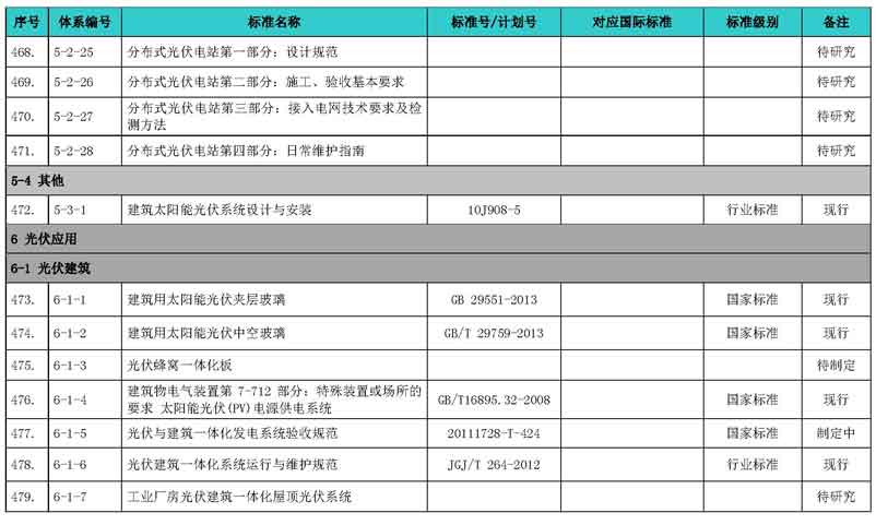 光伏產(chǎn)業(yè)綜合標(biāo)準(zhǔn)化技術(shù)體系表涵蓋國家標(biāo)準(zhǔn)和行業(yè)標(biāo)準(zhǔn),包括現(xiàn)有標(biāo)準(zhǔn)、制修訂中的標(biāo)準(zhǔn)、擬制修訂的標(biāo)準(zhǔn)和待研究的標(biāo)準(zhǔn),共500項(xiàng)。