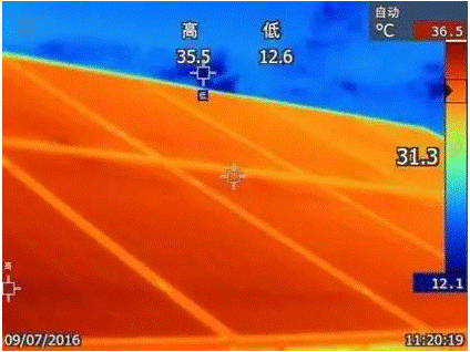 當(dāng)同一組串中的某片太陽電池輸出電流明顯小于其他太陽電池輸出電流時,這片太陽電池會成為負(fù)載被其他太陽電池片反向充電而發(fā)熱,即產(chǎn)生熱斑。利用紅外成像可以檢測組件是否出現(xiàn)熱斑,該項目對4000塊光伏組件進(jìn)行了紅外熱像檢測,未發(fā)現(xiàn)異常發(fā)熱現(xiàn)象。