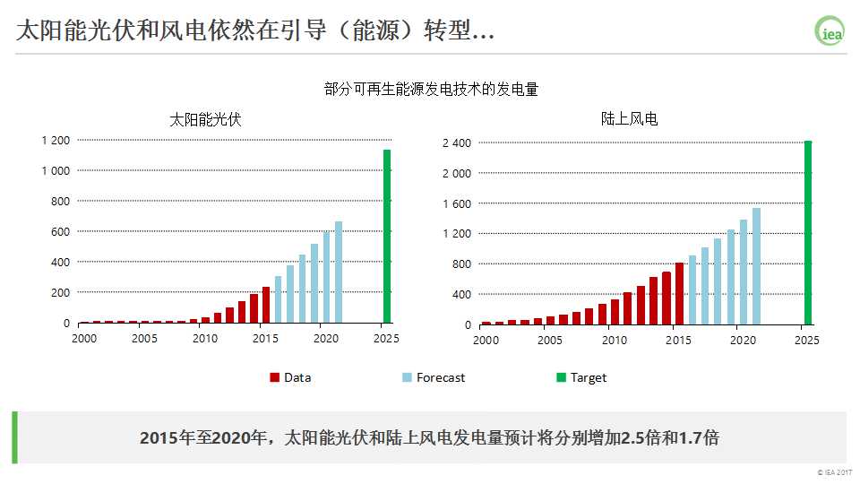 把這些趨勢進(jìn)一步延伸至2025年,國際能源署認(rèn)為我們正處于實(shí)現(xiàn)2DS情景目標(biāo)的軌跡上,這在發(fā)電量上可以得到體現(xiàn)。