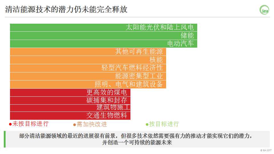 IEA 的《追蹤清潔能源技術(shù)進(jìn)展》 (TCEP)報(bào)告每年都會(huì)評(píng)估最新的技術(shù)進(jìn)步和市場發(fā)展,跟蹤總體進(jìn)展,并對(duì)未來行動(dòng)提出建議。今年的TCEP 報(bào)告顯示,我們選擇的26項(xiàng)清潔能源技術(shù)中,只有3項(xiàng)處在可以實(shí)現(xiàn)能源可持續(xù)轉(zhuǎn)型的路徑上。 15項(xiàng)技術(shù)只顯示出一定的進(jìn)步,8項(xiàng)完全沒有按照目標(biāo)進(jìn)行,需要新的行動(dòng)。