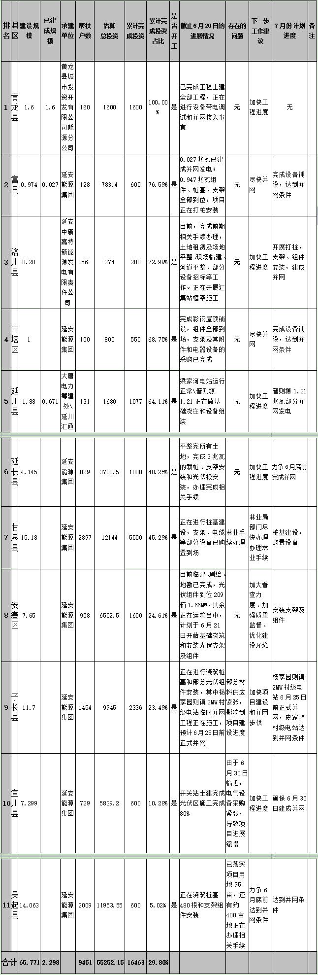 延安市光伏扶貧項(xiàng)目村級(jí)電站(包含戶用系統(tǒng))6月份進(jìn)度情況匯總表