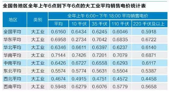 上表是全國各地區(qū)全年上午6點到下午6點的大工業(yè)平均銷售電價統(tǒng)計表。