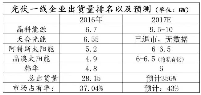 前五大光伏組件產(chǎn)業(yè)去年總出貨量28.15GW,占去年總銷售量的37.04%,今年前五大企業(yè)預(yù)計出貨量會達(dá)到35GW,市場占有率會進一步提升至43%,其中晶科能源增長最為迅速(負(fù)債率也相對偏高),預(yù)計2017年將會穩(wěn)固光伏一哥的位置。這其中天合光能已經(jīng)于去年退市,晶澳太陽能也提出了私有化邀約(6.8$)且這個私有化邀約沒比當(dāng)前股價(6.5$)高多少,除非撤銷要約或者邀約不通過,不然晶澳太陽能上漲空間有限。剩下的幾大巨頭表現(xiàn)都非常好,而且即便經(jīng)過這一輪暴漲,大部分公司股價依舊在凈資產(chǎn)一下,算是價值發(fā)現(xiàn)的一輪行情。