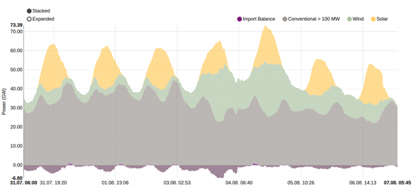 如上圖所示,可以觀察到最近一周德國的用電來源分布。