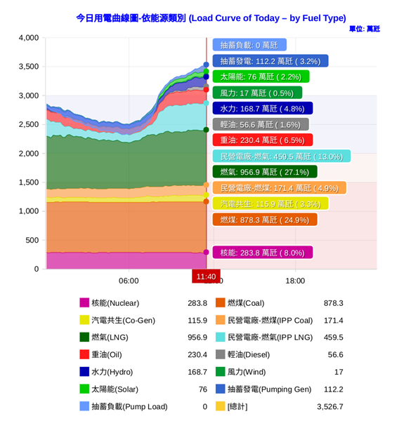 同一個(gè)時(shí)段,風(fēng)力的發(fā)電量也比其他時(shí)段來的高。這也說明,德國的尖峰用電大部分是靠太陽能、風(fēng)力等潔凈能源,且順應(yīng)其發(fā)電特性所供給。相較之下,基礎(chǔ)發(fā)電的火力、核能在尖峰用電時(shí)刻的供電比重改變不大;反觀臺(tái)灣的尖峰時(shí)刻用電,則仍是以燃?xì)、燃油等火力補(bǔ)充發(fā)電為主。