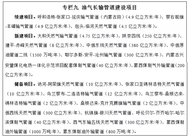 統(tǒng)籌考慮自治區(qū)石油天然氣資源以及煤制燃料項(xiàng)目建設(shè)情況,進(jìn)一步完善油氣管網(wǎng),提高油氣供應(yīng)保障能力!笆濉逼陂g,建成陜京四線、中俄東線、建平-赤峰、呼和浩特-張家口-延慶輸氣管道(內(nèi)蒙古段)、包頭-臨河、大路-和林格爾、察右前旗-豐鎮(zhèn)輸氣管道和中俄原油管道二線等項(xiàng)目。根據(jù)市場(chǎng)發(fā)展及油氣源項(xiàng)目建設(shè)情況,適時(shí)推進(jìn)訥河-阿榮旗、張家口至錫林浩特、烏蘭察布-二連浩特、烏蘭察布-桑根達(dá)來-錫林浩特、桑根達(dá)來-克什克騰旗、中俄西線、杭錦旗-銀川天然氣管道、呼倫貝爾-齊齊哈爾-哈爾濱煤制氣、西氣東輸五線輸氣管道和蒙西、蒙東煤制油外輸管道等項(xiàng)目的前期工作。“十三五”期間,力爭(zhēng)新增輸油能力1500萬噸、輸氣能力657億立方米左右。加大油氣長輸管道安全隱患排查和整改力度,持續(xù)開展油氣長輸管道安全大排查、大整治專項(xiàng)行動(dòng)。加強(qiáng)儲(chǔ)氣設(shè)施建設(shè),進(jìn)一步提高天然氣調(diào)峰和應(yīng)急儲(chǔ)氣能力。