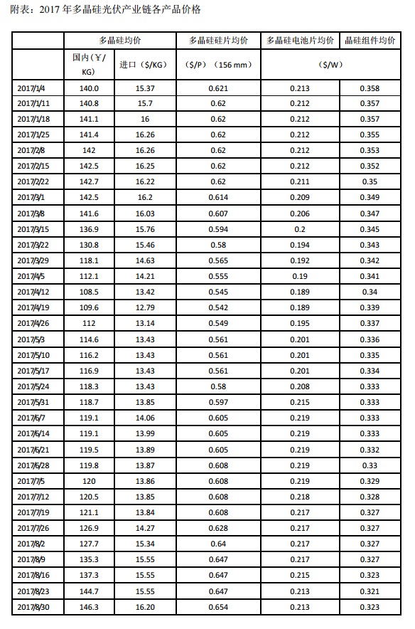 2017年以來,產(chǎn)能優(yōu)化和新增產(chǎn)能釋放從未停歇,國內(nèi)有效產(chǎn)能從年初的21萬噸/年一路增加至8月底的25.6萬噸/年,增幅達(dá)到21.9%,增量包括新特能源、四川永祥、洛陽中硅等的產(chǎn)能優(yōu)化,以及新疆大全、江蘇康博、東方希望、寧夏東夢、河南恒星等新增產(chǎn)能。8月份之后,陸續(xù)將有大批產(chǎn)能投放市場,包括年底前將釋放的鄂爾多斯多晶硅8000噸/年、天宏瑞科1.9萬噸/年、東方希望1.5萬噸/年,預(yù)計(jì)年底前國內(nèi)多晶硅產(chǎn)能將達(dá)到30.4萬噸/年。