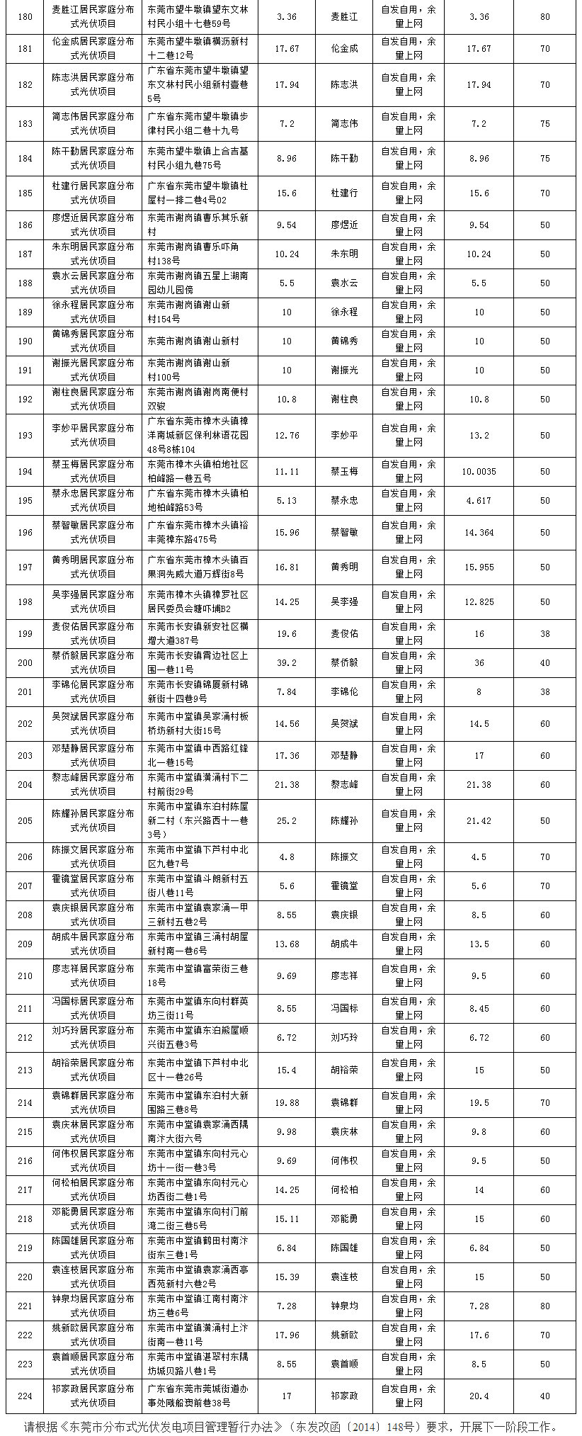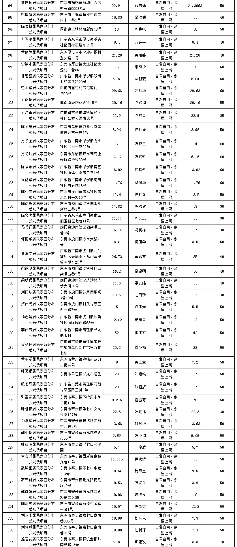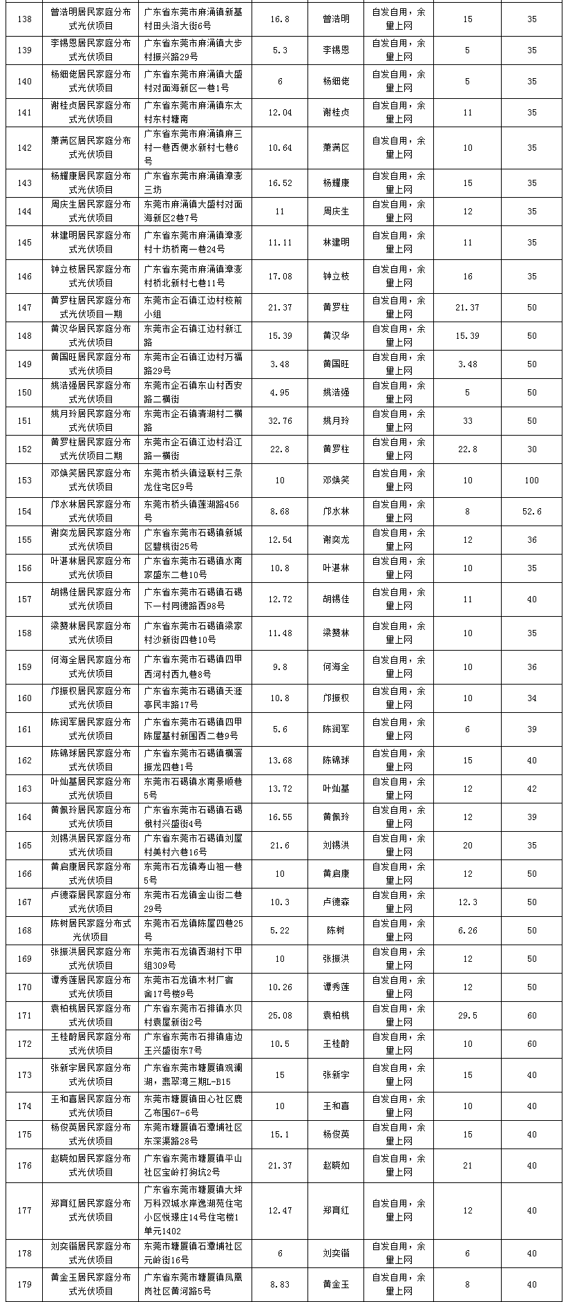 廣東東莞224個家庭分布式光伏項目備案信息表