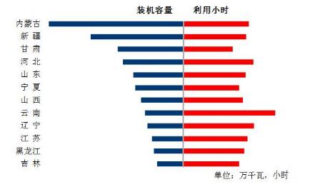 圖6 1-8月份風(fēng)電裝機(jī)較多省份風(fēng)電裝機(jī)容量和設(shè)備利用小時