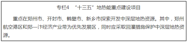 加大地?zé)崮荛_發(fā)利用研究,完善地?zé)崮荛_發(fā)利用相關(guān)標準、政策、價格等行業(yè)管理體系。以“地?zé)崴h(huán)利用”為指導(dǎo)原則,積極推進水熱型地?zé)峁┡M行傳統(tǒng)供暖區(qū)域的清潔能源供暖替代,將水熱型地?zé)崮芄┡{入城鎮(zhèn)基礎(chǔ)設(shè)施建設(shè)中,集中規(guī)劃,統(tǒng)一開發(fā)。按照“因地制宜,集約開發(fā),加強監(jiān)管,注重環(huán)!钡脑瓌t,除城鎮(zhèn)地下空間利用規(guī)劃的區(qū)域外,在公共建筑和新建住宅小區(qū)等區(qū)域鼓勵開發(fā)利用淺層地?zé)崮堋Mㄟ^技術(shù)進步、規(guī)范管理解決目前淺層地?zé)崮荛_發(fā)中出現(xiàn)的問題。結(jié)合大氣污染治理,重點在鄭州、開封、鶴壁、新鄉(xiāng)等清潔供暖試點城市探索開展地?zé)崮馨l(fā)電示范項目。到2020年,新增地?zé)崮芄┡娣e8200萬平方米。