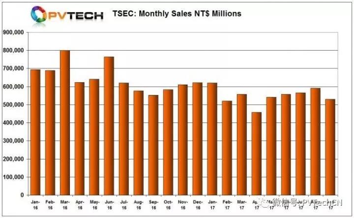 元晶太陽能公布其2017年9月份營收額為5.3億新臺幣(約合1.745億美元),環(huán)比8月份的5.9億新臺幣有所下降。