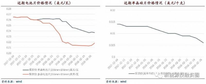 2018年單晶硅片龍頭隆基股份三次調(diào)價,目前單晶硅片國內(nèi)報價4.55元/片、國外報價0.63美元,總降價達(dá)到0.85元/片。同時2018年1-2月份多晶硅價格呈現(xiàn)出明顯的“斷崖式下跌”走勢,2月初開始,多晶硅價格瞬間斷崖式下跌,2月底價格為12.46萬元/噸,降幅高達(dá)18.6%。2月均價12.96萬元/噸,環(huán)比下滑15.3%。電池片和組件的環(huán)節(jié)較為平穩(wěn),我們認(rèn)為經(jīng)過一季度的淡季,價格大幅調(diào)整后,在二季度即將迎來搶裝,各個環(huán)節(jié)價格趨于穩(wěn)定。