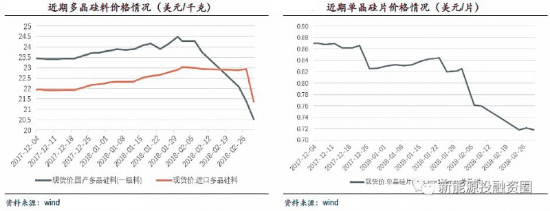 可以看到從2017年底開始,組件環(huán)節(jié)首先開始降價,此時產(chǎn)業(yè)其他環(huán)節(jié)價格還比較平穩(wěn),甚至多晶硅料環(huán)節(jié)還在漲價。進(jìn)入2018年后組件售價依然緩慢下降,上游硅片出現(xiàn)斷崖式下跌,之后電池片環(huán)節(jié)開始大幅降價,進(jìn)入2018年2月后,以隆基股份為代表的龍頭企業(yè)再次主動降價,同時硅料端開始大幅降價。產(chǎn)業(yè)鏈價格已經(jīng)完成一輪相對完整的下跌周期,我們預(yù)計隨著二季度開始需求的好轉(zhuǎn),各個產(chǎn)業(yè)環(huán)節(jié)價格開始企穩(wěn)。