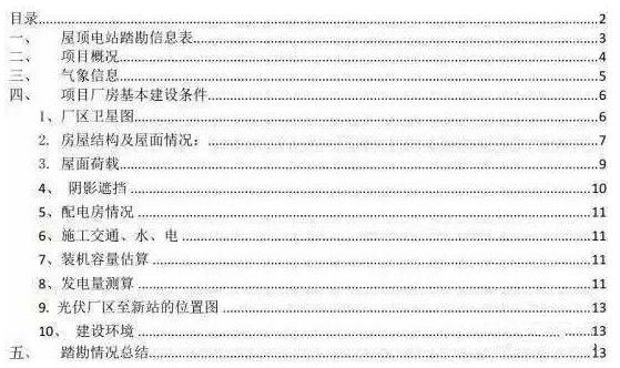 (1)技術(shù)部門:主要從載荷驗(yàn)算,光照強(qiáng)度,裝機(jī)容量,電網(wǎng)接入情況等進(jìn)行項(xiàng)目評(píng)估,必要的情況需要進(jìn)行現(xiàn)場勘查,形成如下勘查報(bào)告: