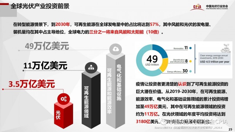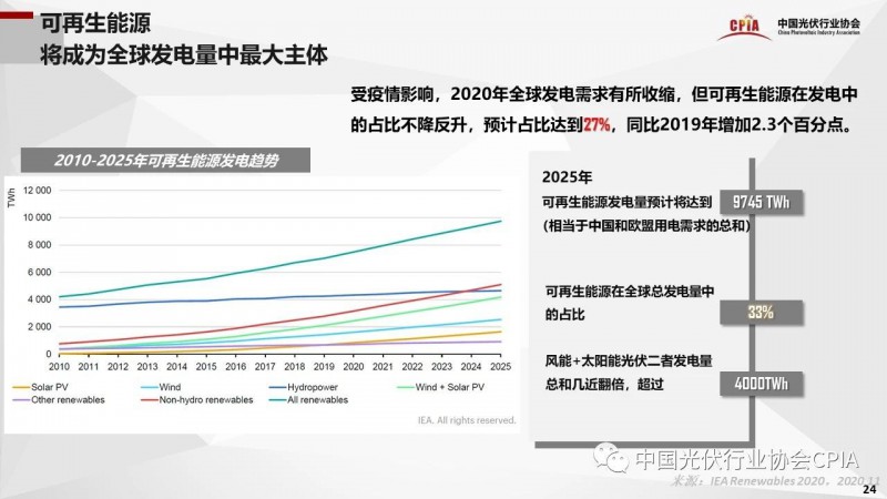 12月10舉辦的“2020年中國光伏行業(yè)協(xié)會年度大會”上,中國光伏行協(xié)會副理事長兼秘書長王勃華作光伏行業(yè)“十三五”發(fā)展回顧與“十四五”形勢展望的報告。報告透露:在2019——2025年,可再生能源將滿足99%的全球電力需求增量。到2025年,可再生能源在新增發(fā)電裝機中占比將達到95%;光伏在所有可再生能源新增裝機中的占比將達到40