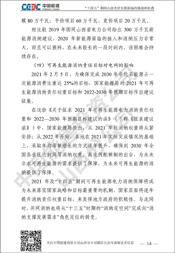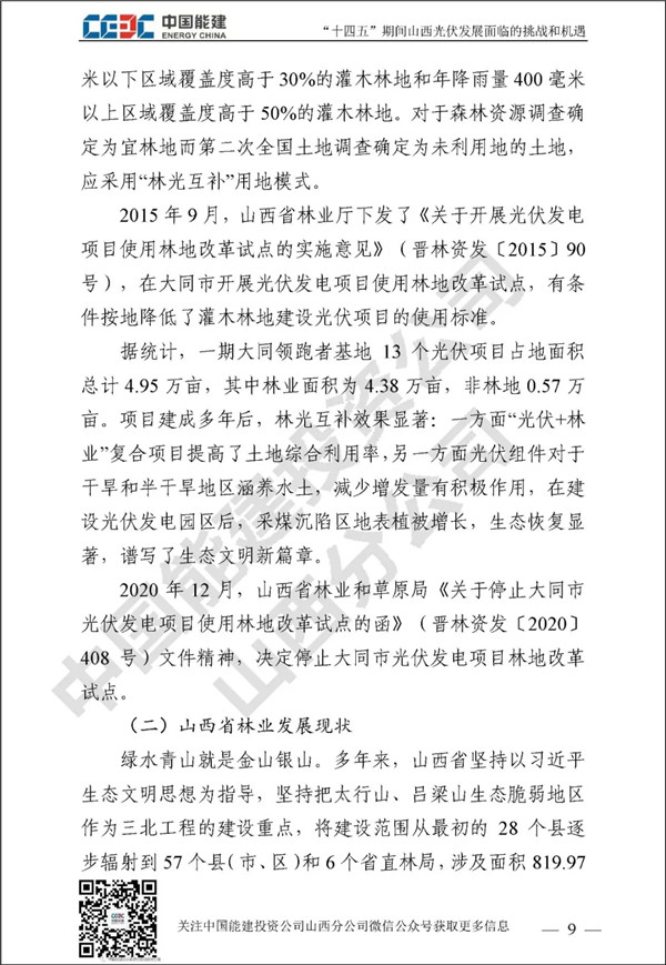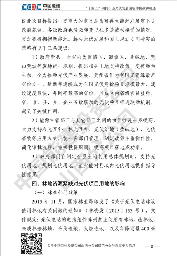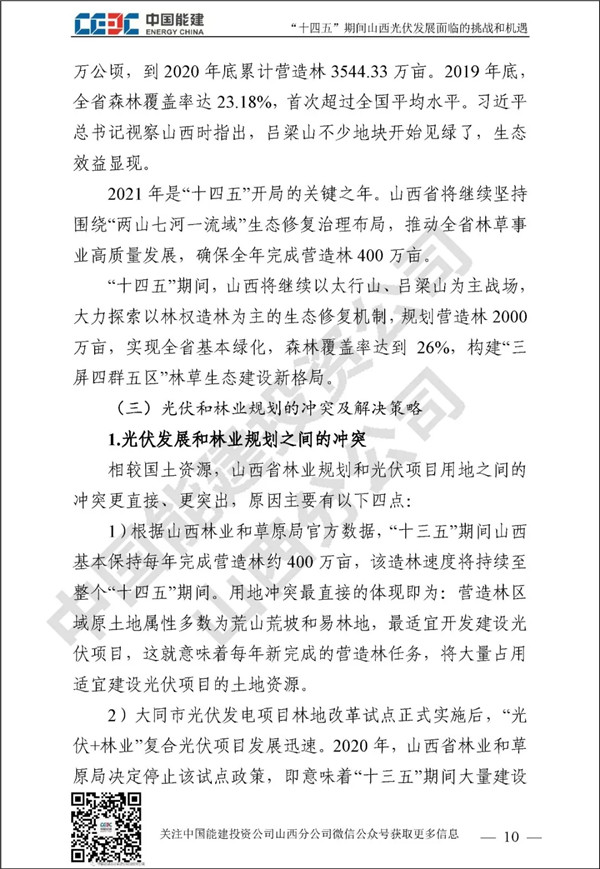 山西作為我國絕對的電力大省,“十三五”期間新能源發(fā)展成績矚目!疤歼_(dá)峰”和“碳中和”目標(biāo)對山西新能源行業(yè)發(fā)展既是挑戰(zhàn)更是機(jī)遇。中國能建投資公司山西分公司通過對諸多和光伏未來發(fā)展相關(guān)的政府規(guī)劃、行業(yè)政策、關(guān)鍵數(shù)據(jù)進(jìn)行歸納整理,并進(jìn)行分析研究,針對“土地和消納土地資源緊缺和電網(wǎng)消納困難”已經(jīng)成為光伏發(fā)展最大攔路虎這一行業(yè)