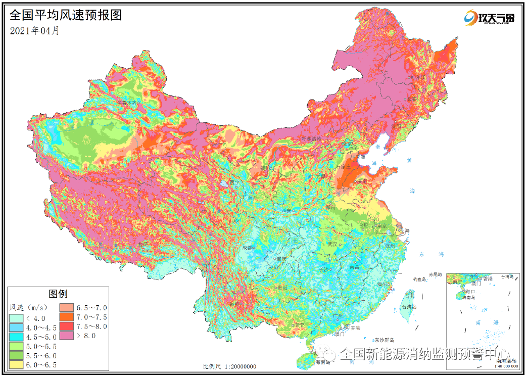 附圖1 全國(guó)2021年4月平均風(fēng)速分布預(yù)報(bào)圖