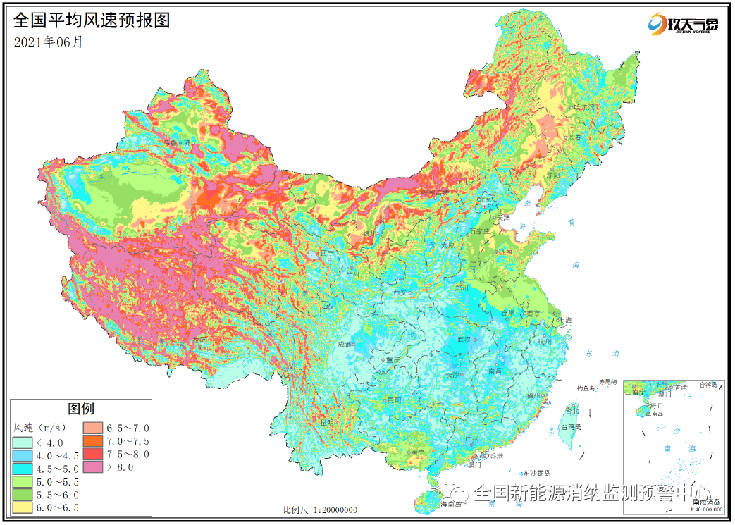 附圖5 全國(guó)2021年6月平均風(fēng)速分布預(yù)報(bào)圖