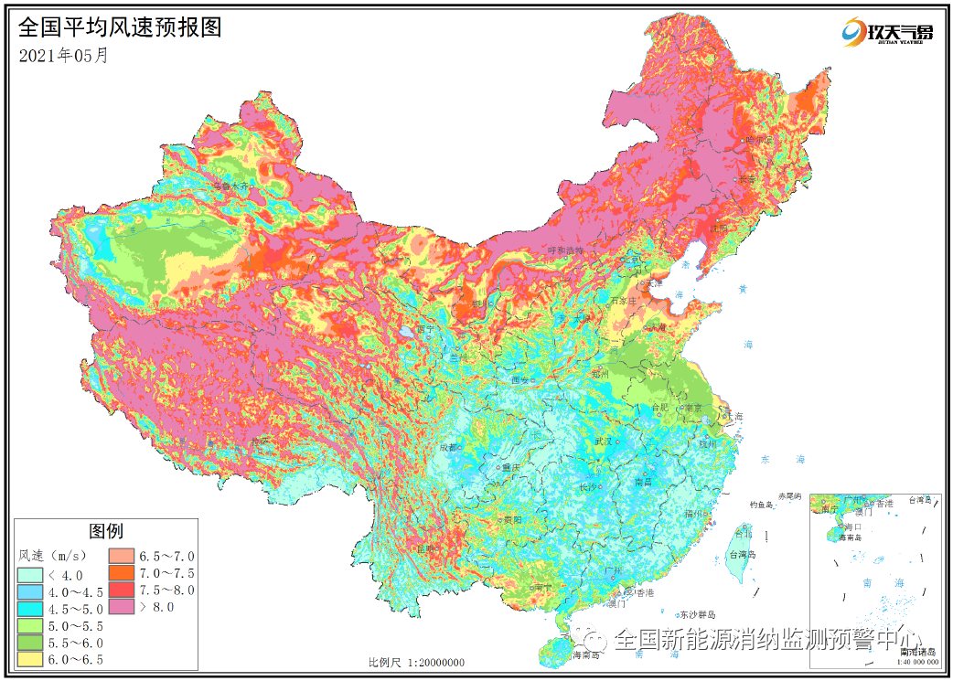 附圖3 全國(guó)2021年5月平均風(fēng)速分布預(yù)報(bào)圖