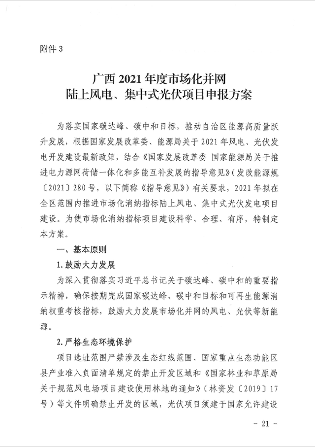 6月18日,廣西發(fā)改委發(fā)布《關(guān)于申報2021年陸上風(fēng)電、光伏發(fā)電項目的通知》,通知提出:2021年,廣西擬新增光伏保障性并網(wǎng)項目建設(shè)指標(biāo)400萬千瓦左右,風(fēng)電保障性并網(wǎng)項目建設(shè)指標(biāo)500萬千瓦左右。