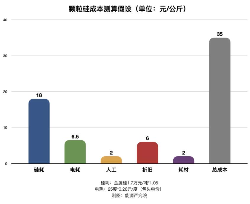 一項關(guān)于顆粒硅成本預(yù)想測算表明,在統(tǒng)計硅耗、電耗、人工、折舊、耗材等成本要素后,顆粒硅的全成本約為每公斤不足35元,甚至更低。