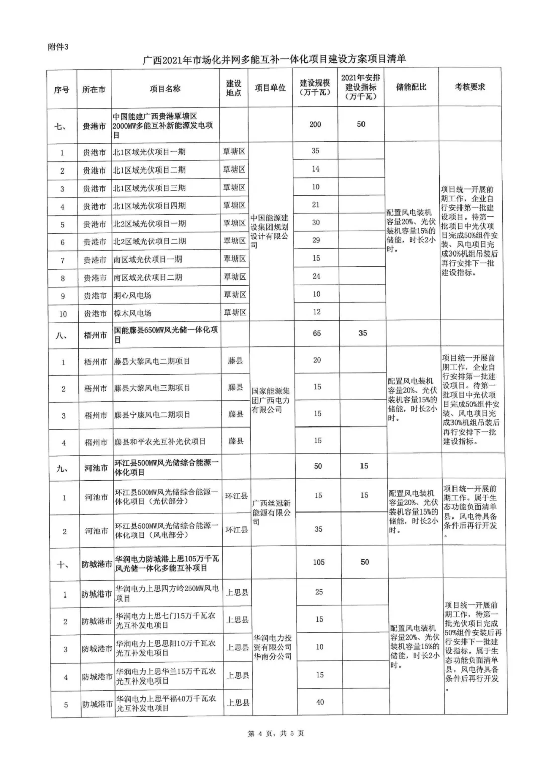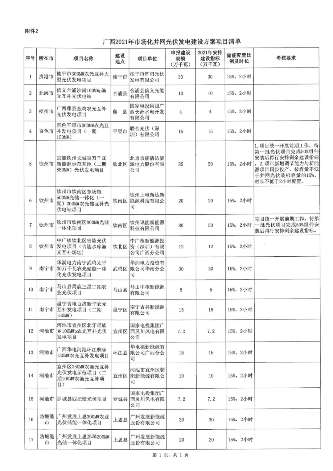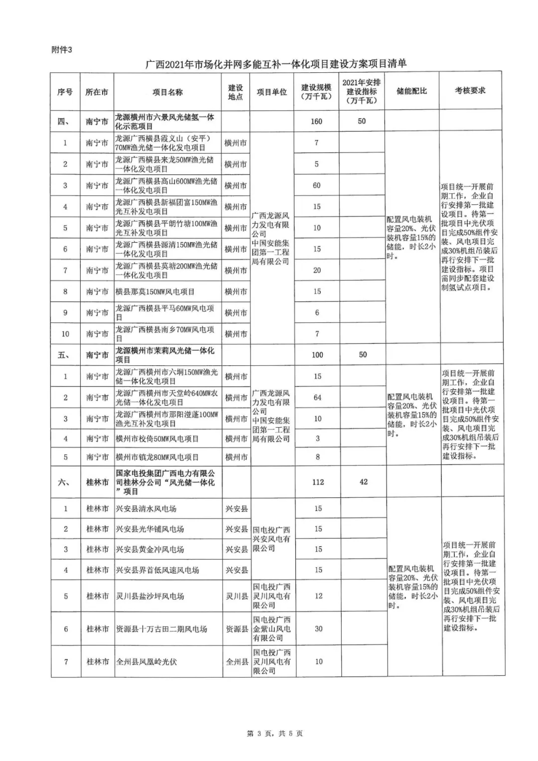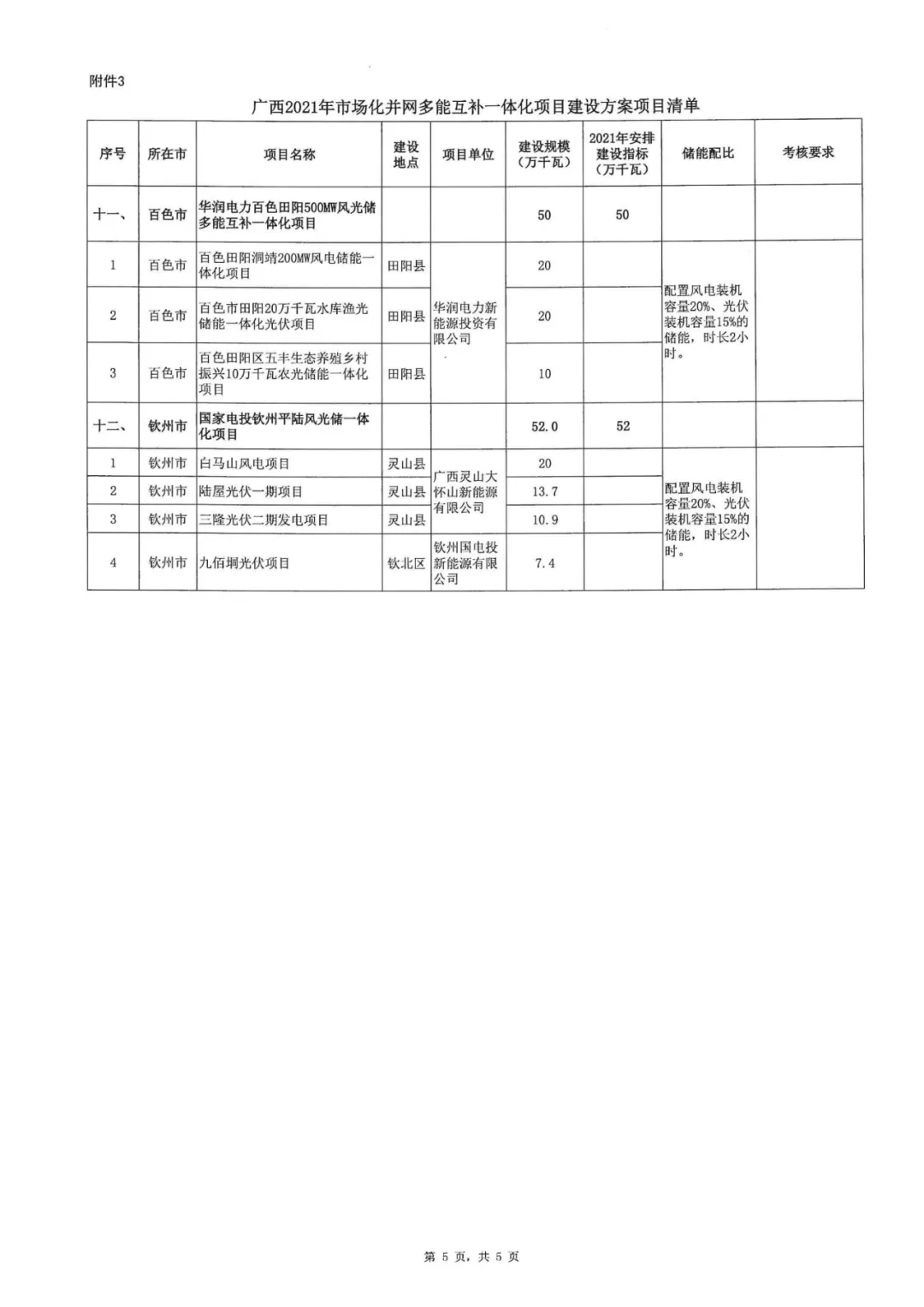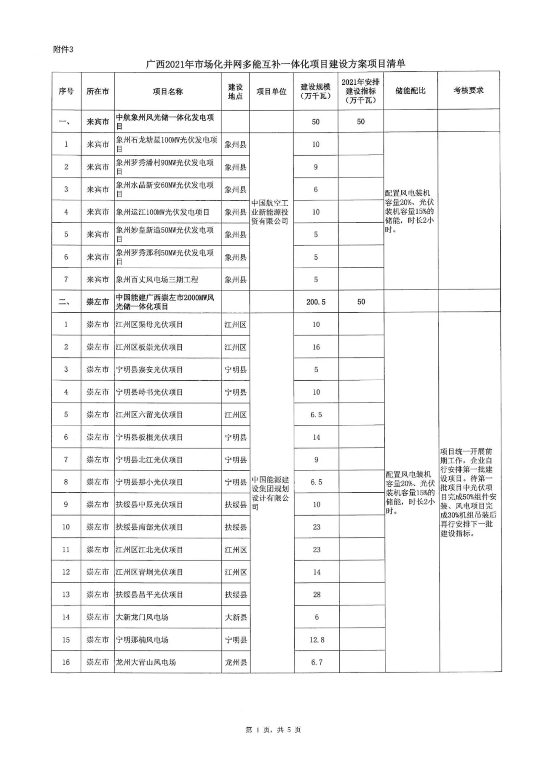 10月9日,廣西壯族自治區(qū)能源局正式印發(fā)《2021年市場化并網陸上風電、光伏發(fā)電及多能互補一體化項目建設方案的通知》,列入2021年市場化并網陸上風電建設方案的項目共22個,總規(guī)模325.1萬千瓦。2021年安排325.1萬千瓦,配20%*2h儲能;列入2021年市場化并網光伏發(fā)電建設方案的項目共17個,總規(guī)模395.4