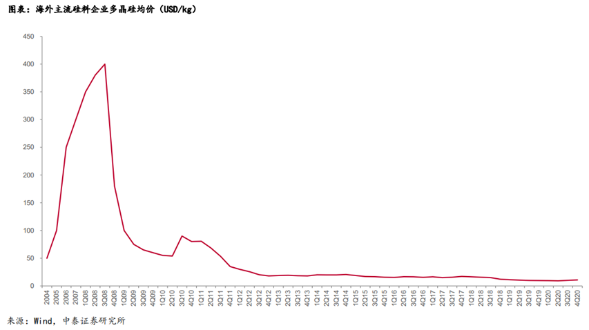 翻開(kāi)多晶硅的歷史我們發(fā)現(xiàn),2008年也曾經(jīng)上演過(guò)“擁硅為王”、硅料限制行業(yè)發(fā)展的故事,硅料歷史最高價(jià)格曾達(dá)400美元/kg。彼時(shí),我國(guó)的光伏產(chǎn)業(yè)主要集中在中游,多晶硅行業(yè)發(fā)展較晚,技術(shù)上被國(guó)外封鎖,但是隨著資本的介入,逐步打破了技術(shù)枷鎖,國(guó)內(nèi)企業(yè)開(kāi)始大規(guī)模擴(kuò)產(chǎn)。