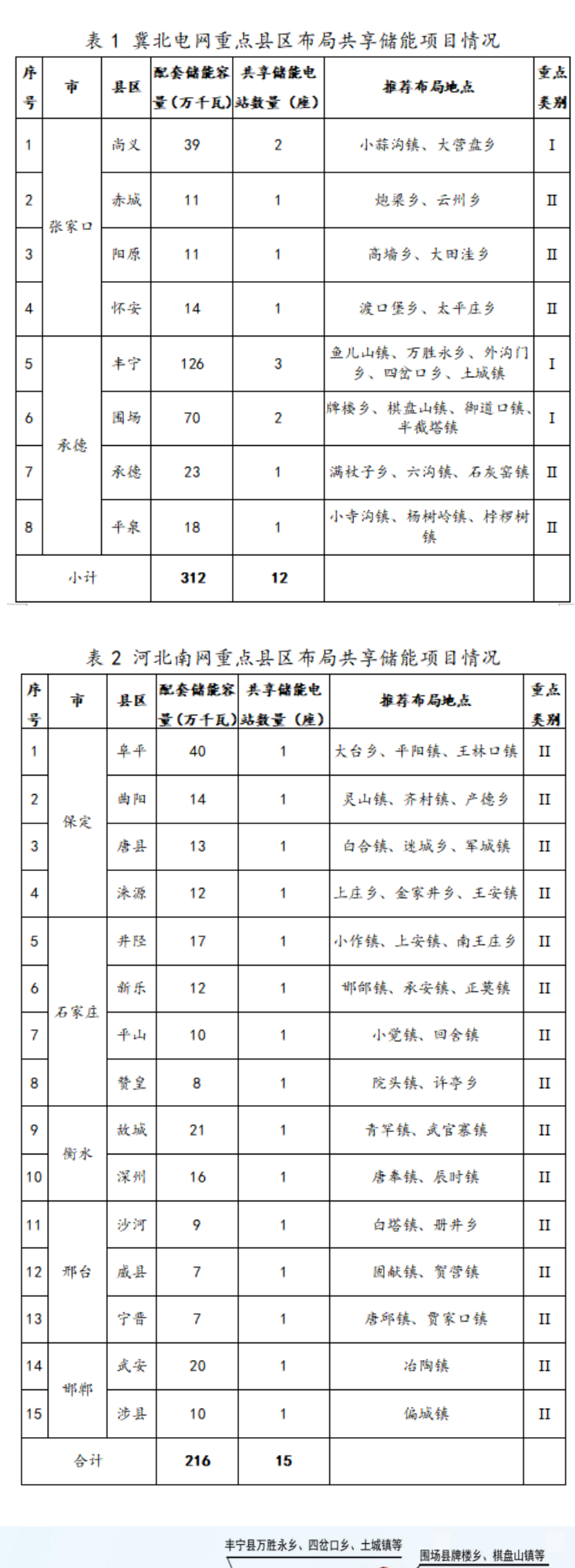(二)II類縣區(qū)布局。經(jīng)測(cè)算,II類縣區(qū)20個(gè),包括赤城、陽(yáng)原、懷安、承德、平泉、阜平、曲陽(yáng)、唐縣、淶源、井陘、新樂(lè)、平山、贊皇、故城、深州、沙河、威縣、寧晉、武安、涉縣,每個(gè)縣區(qū)可布局1個(gè)共享儲(chǔ)能電站,每座儲(chǔ)能電站建設(shè)規(guī)模不低于10萬(wàn)千瓦、不高于30萬(wàn)千瓦(見(jiàn)表圖)。其余按配套儲(chǔ)能單獨(dú)建設(shè)。