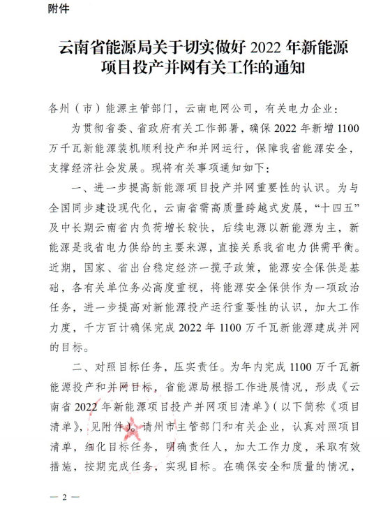 7月12日,云南省能源局發(fā)布了《關(guān)于征求2022年新能源建設(shè)方案》和《關(guān)于征求2022年新能源項(xiàng)目投產(chǎn)并網(wǎng)有關(guān)意見(jiàn)建議的函》,目前這個(gè)兩個(gè)文件均為征求意見(jiàn)稿。