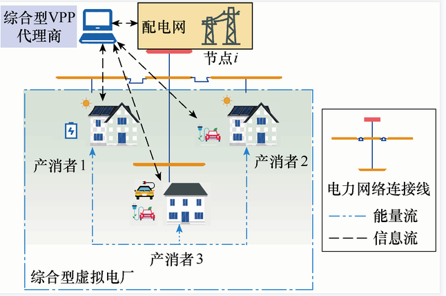 此外,在智能樓宇的電能優(yōu)化管理中,點(diǎn)對點(diǎn)電能共享方式有助于提升樓宇群的集體收益。但是相關(guān)文獻(xiàn)中采用集中管理策略,未充分考慮產(chǎn)消者對隱私安全的擔(dān)憂。基于上述背景,本文研究的虛擬電廠包含多數(shù)量、多類型的DERs,對外能呈現(xiàn)較大范圍的出力特性,同時(shí)通過內(nèi)部各類產(chǎn)消者的互通互濟(jì),提升區(qū)域內(nèi)可再生能源的消納能力,因而將其定義為綜合型虛擬電廠。