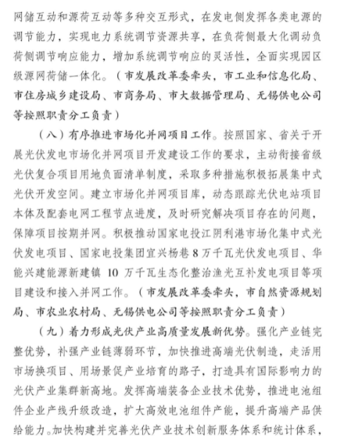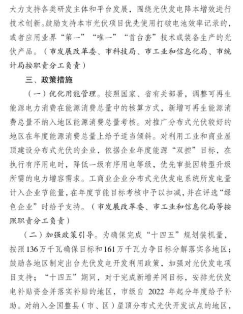 10月11日,江蘇無錫市政府發(fā)布《關(guān)于大力推進全市光伏發(fā)電規(guī)模化開發(fā)應(yīng)用的實施意見》!秾嵤┮庖姟诽岢,“十四五”期間,對于完成新增并網(wǎng)目標,安排光伏發(fā)電補貼資金并落實補貼的地區(qū),市級自 2022年起分年度給予補助。對納入全國整縣(市、區(qū))屋頂分布式光伏開發(fā)試點的地區(qū),最高按其年度實際發(fā)放光伏發(fā)電專項補貼總