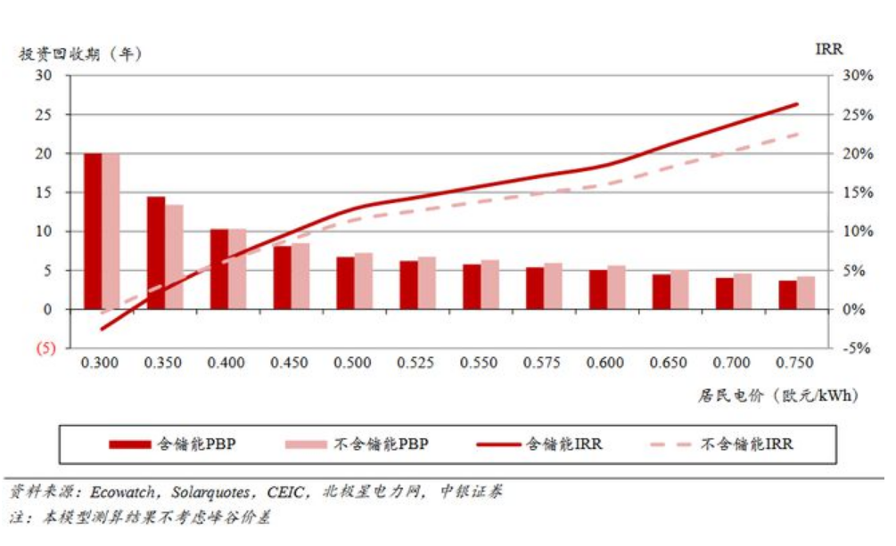圖:歐洲戶用光儲(chǔ)系統(tǒng)投資回收期與IRR彈性測(cè)算