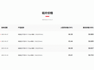 4月27日,隆基綠能公示單晶硅片最新價(jià)格。其中,p型M10(182mm)150μm厚度價(jià)格:由6.5元下調(diào)至6.3元,跌幅3.08%;p型M6(166mm)150μm厚度價(jià)格由5.61元下調(diào)至5.44元,跌幅3.03%。