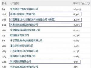 位于虧損企業(yè)前五名的企業(yè)中,光伏行業(yè)占據(jù)了半壁江山。在全部21家虧損的中國(guó)500強(qiáng)企業(yè)中,新能源企業(yè)占了三分之一。尚德太陽(yáng)能電力有限公司虧損6418百萬(wàn)元;江西賽維LDK太陽(yáng)能高科技有限公司(美國(guó))虧損4130百萬(wàn)元;英利綠色能源控股有限公司虧損3209百萬(wàn)元;韓華新能源有限公司虧損930百萬(wàn)元;阿特斯太陽(yáng)能有限公司虧損572百萬(wàn)元;晶澳太陽(yáng)能有限公司虧損564百萬(wàn)元;常州天合光能有限公司虧損238百萬(wàn)元。中新網(wǎng)能源頻道統(tǒng)計(jì),7家新能源企業(yè)累計(jì)虧損16061百萬(wàn)元,即160.61億。