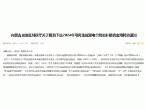 11月24日,內(nèi)蒙古自治區(qū)財(cái)政廳發(fā)布《關(guān)于提前下達(dá)2024年可再生能源電價(jià)附加補(bǔ)助資金預(yù)算的通知》。根據(jù)《通知》,2024年風(fēng)力發(fā)電補(bǔ)助32.6773億元,太陽(yáng)能發(fā)電補(bǔ)助11.8061億元,生物質(zhì)能發(fā)電補(bǔ)助未安排補(bǔ)助預(yù)算,風(fēng)光補(bǔ)助資金總計(jì)44.4834億元。