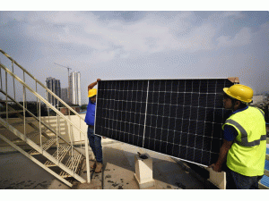 工人在新德里郊區(qū)一棟住宅的屋頂搬運(yùn)太陽(yáng)能電池板。(視覺中國(guó))