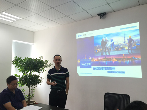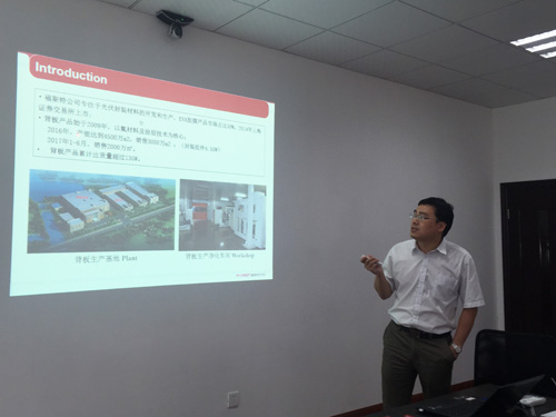 此次“走近背板”主題研討會,邀請了正泰新能源、芯能光伏、悅昇新能源、龍能電力、潤電新能源、瑞能公司、龍瑞電力等一批光伏電站投資開發(fā)企業(yè)負(fù)責(zé)人共三十余人,針對“背板對于組件和電站性能的影響”這一主題,從組件、背板和氟材料三個維度,進(jìn)行了熱烈的探討。中國科學(xué)院太陽光伏發(fā)電系統(tǒng)和風(fēng)力發(fā)電系統(tǒng)質(zhì)量檢測中心組件實(shí)驗(yàn)室曹培亮作為特邀嘉賓和大家進(jìn)行技術(shù)交流。